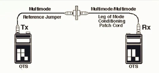 3. Verify whether the connector on the receiver (RX) end of the MM reference jumper is good. Connecting the MM reference jumper to the OTS TX, and connecting another same jumper to another OTS RX. Then link the two MM fiber jumpers and measure the insertion loss across the multimode connector pair (just like the following picture shows). This value should be < 0.5 dB.